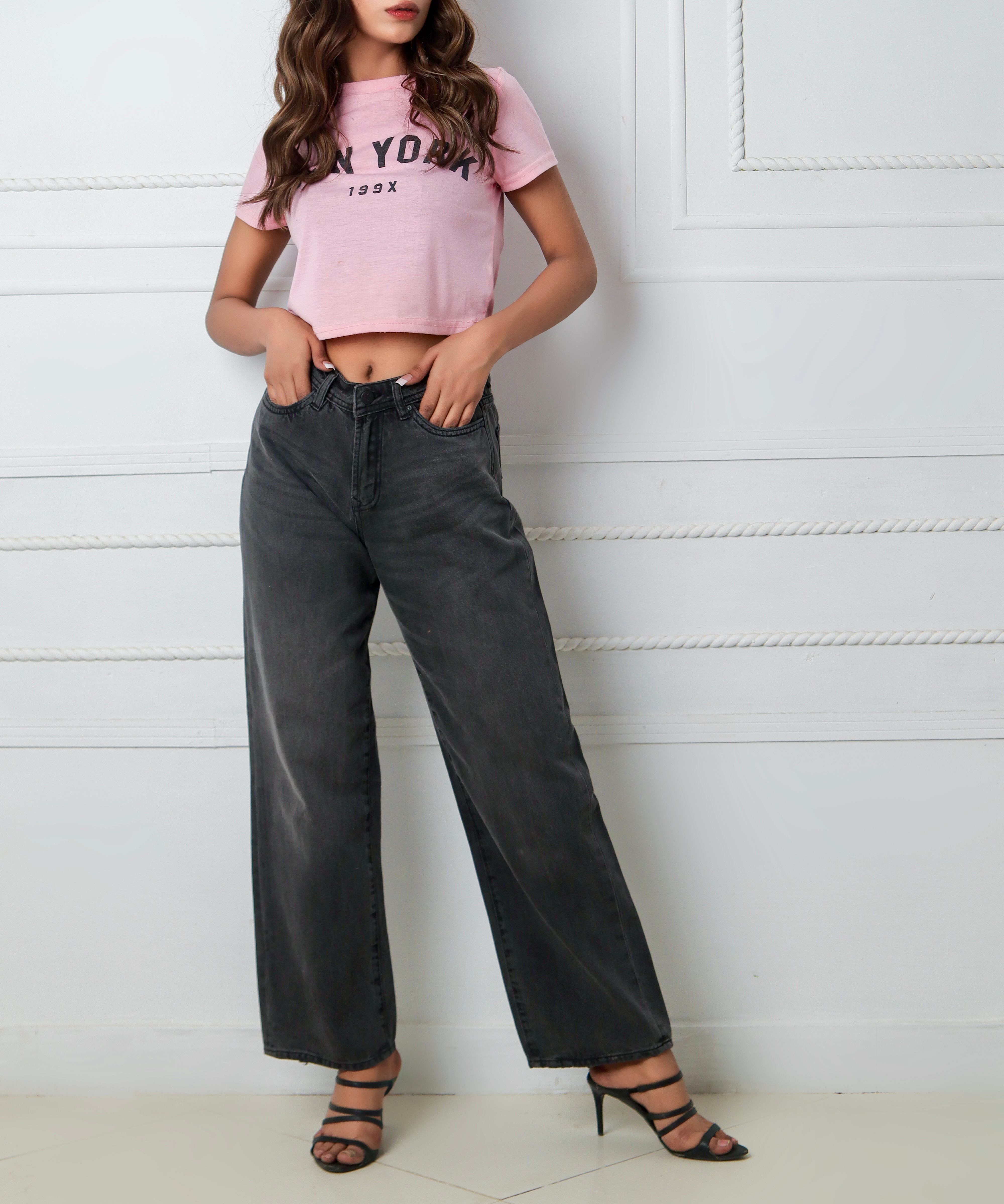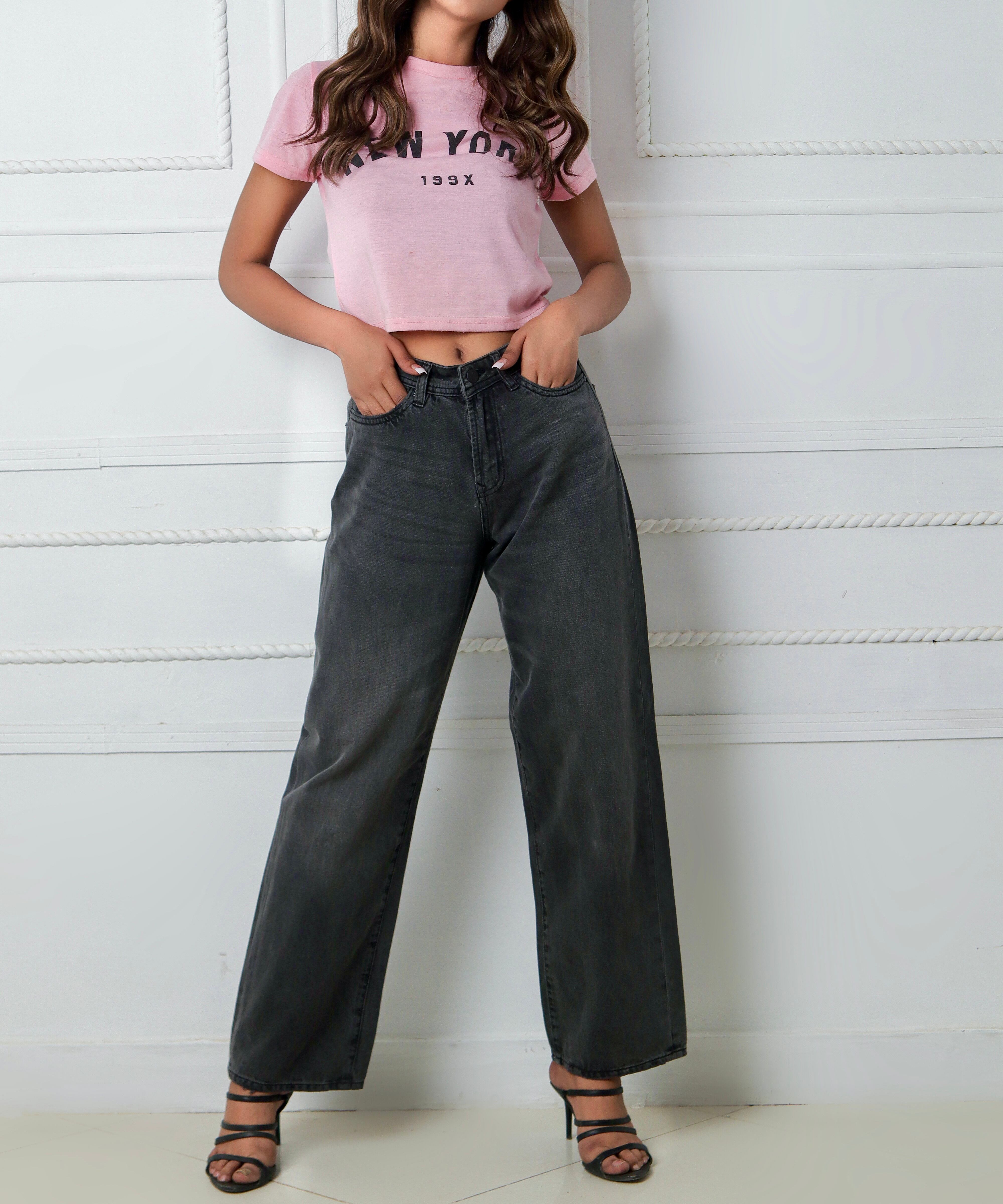 ・London Denim®は、ワイドレッグジーンズにクロップドトップスを合わせ、ベルトでハイウエストを強調することを提案しています。